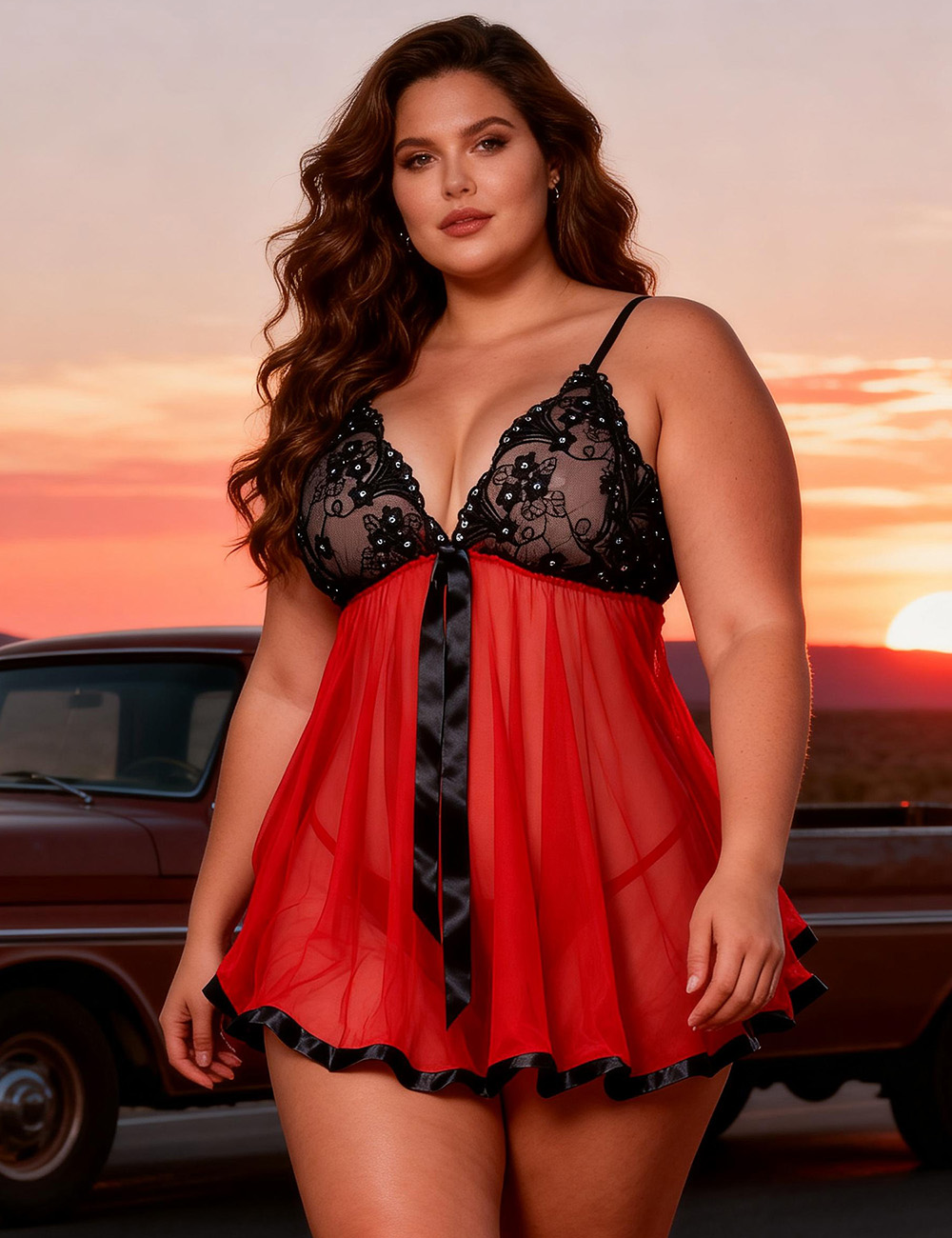 Product Name Black Red Sexy Rhinestone Plus Size See-through Nightdress