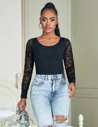 Standard Product Name: Available in black and white, single-sided brushed nylon swim fabric, big round neck, sleeves with lace splice, adhesive process at ankle and neck, crotch with openable snap design, size M-3XL, fashionable lace long-sleeve bodysuit.