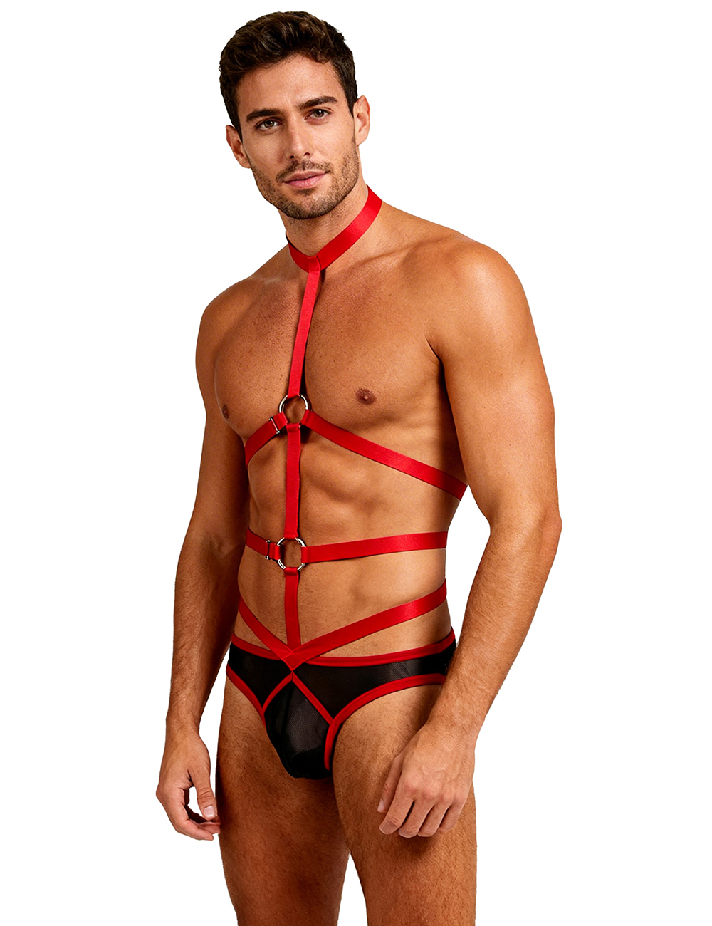 Standard product name: Red, mesh, halter design, front U-shaped pouch design, M-2XL, men`s bondage bodysuit.