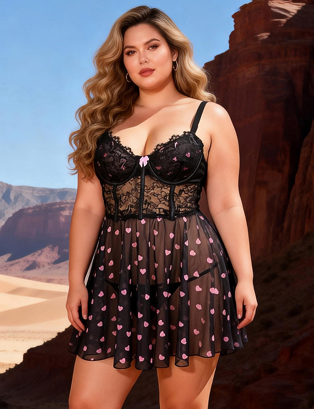 Home > Wholesale Plus Size Lingerie > Black Sexy Heart Printed Lace Mesh Push Up Nightdress