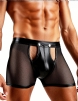 Main promotion keywords: mesh + faux leather fabric, front middle openable U-shaped pouch design, wide elastic waistband, men`s boxers.