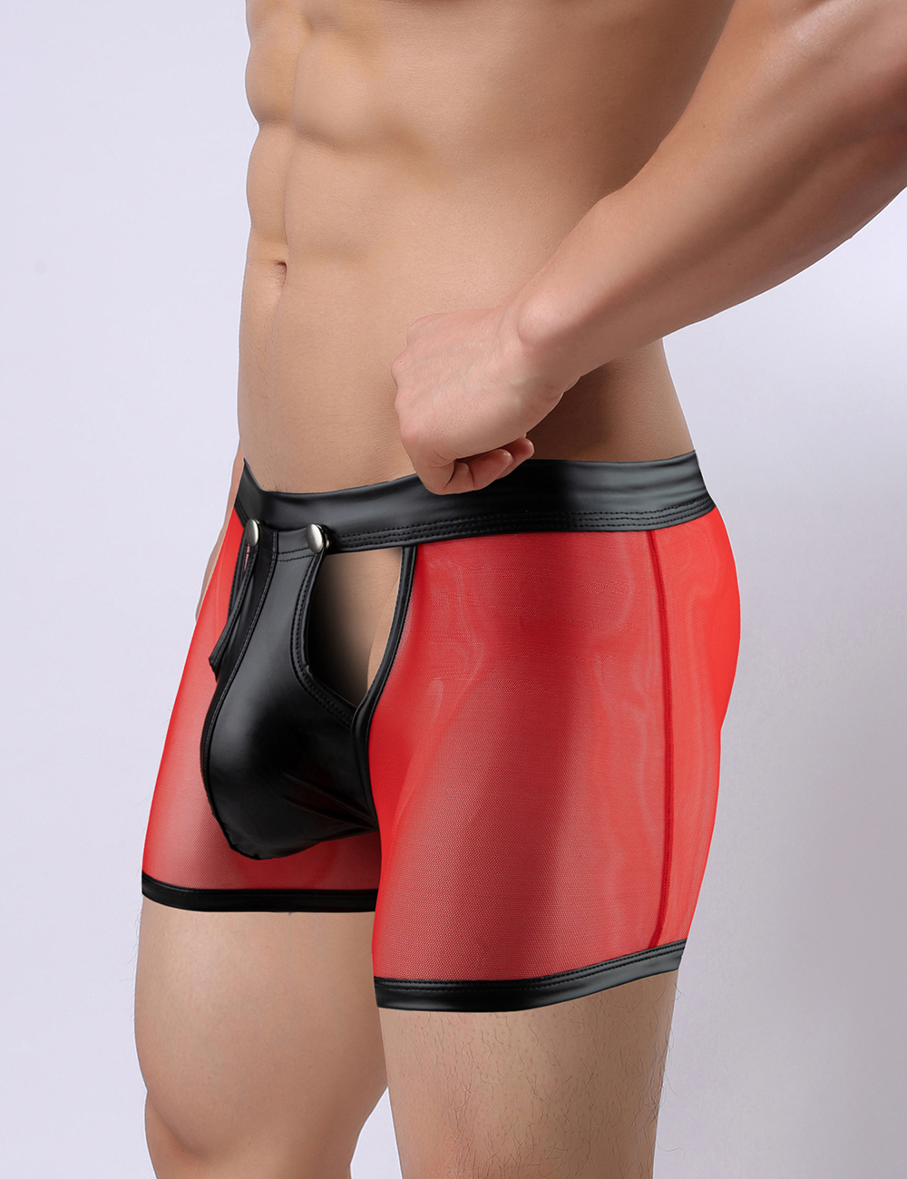 Standard product name: Black and red in 2 colors, mesh + faux leather fabric, front middle openable U-shaped pouch design, M-2XL, men`s sexy boxers.