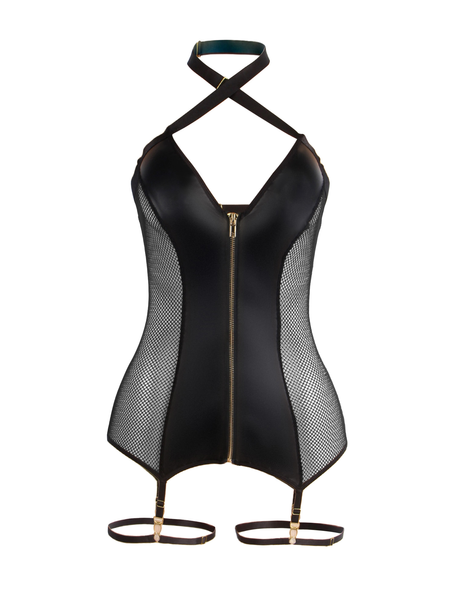 1. Black PU leather with mesh, sexy and subtly revealing; 2. Cross-neck design with front zipper for easy wear; 3. Stainless steel metal buckle connection with detachable leg strap design, full of fun; 4. Hollow back, mesh see-through, fiery and hot.