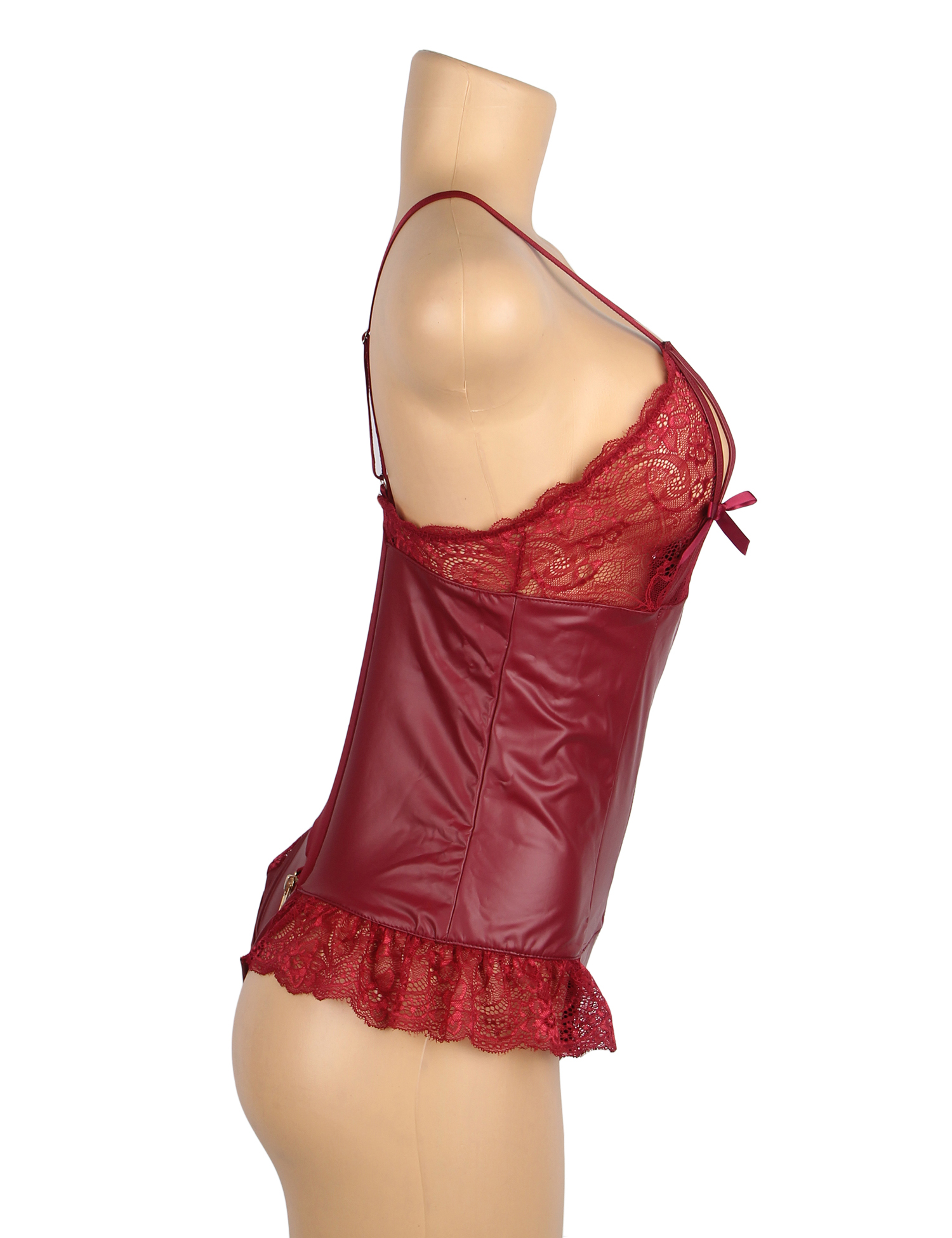 Standard product name: Available in black and red, PU leather, zip style, lace at the chest, ruffled lace at the hem, adjustable straps, M-3XL, sexy PU leather suspender bodysuit.