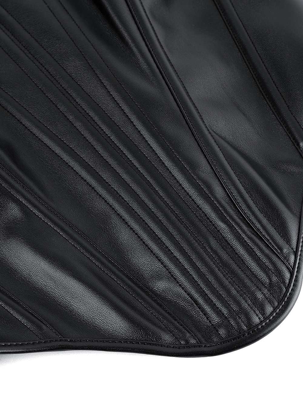 Standard Product Name: Black, faux leather, equipped with 15 soft bones, side zipper, cross-back strap design, with internal inserts, M-3XL plus size, fashionable and sexy faux leather bodysuit