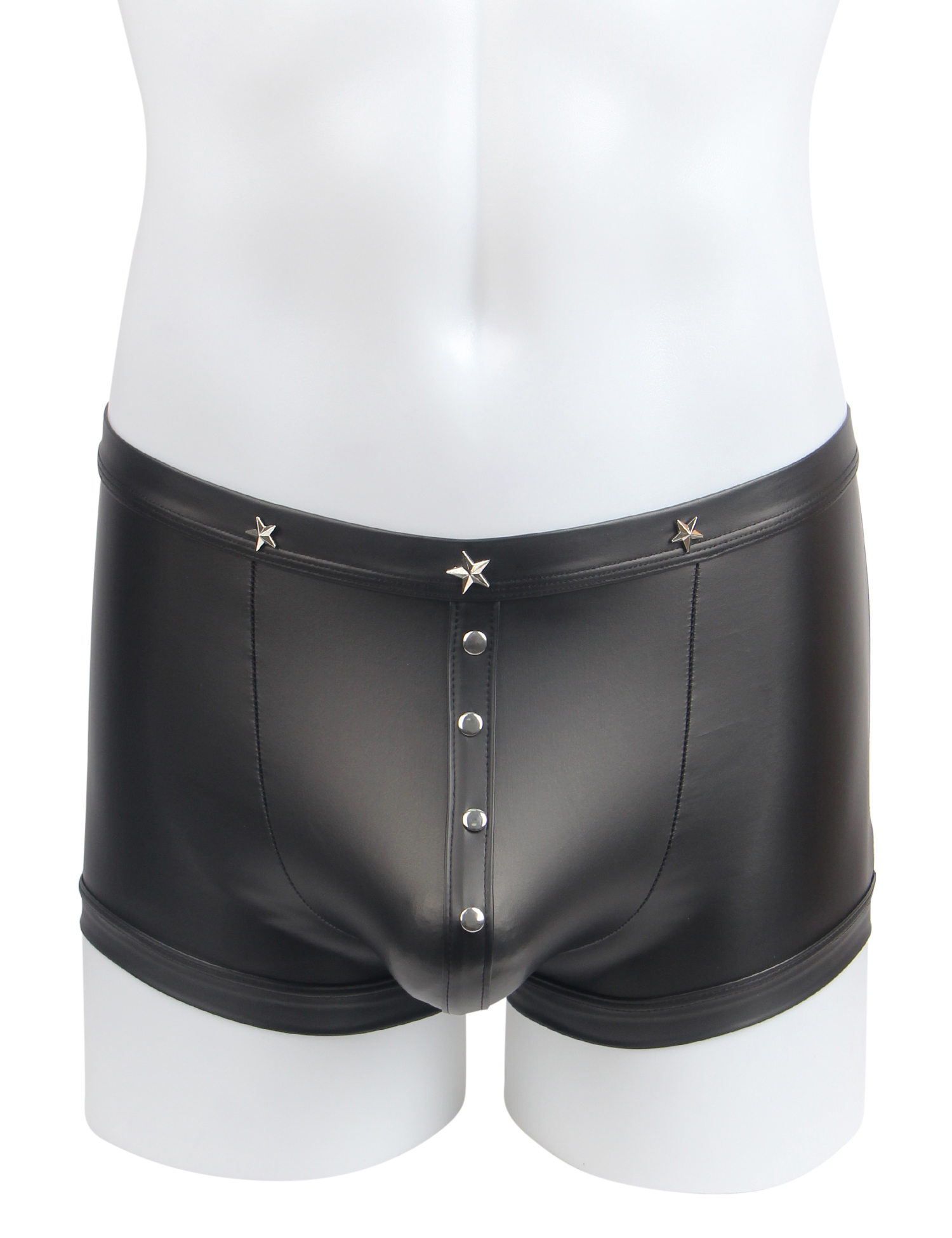 Advantages: 1. Main fabric is PU leather, fashionable and sexy; 2. Features round and five-point star studs, punk trendy; 3. Square cut style, simple and generous; 4. Front U-shaped pouch design, sexy and comfortable Standard product name: Black, PU leather, with round and five-point star studs, square cut style, front U-shaped pouch design, M-3XL, men`s sexy PU leather boxer shorts Main promotional keywords: PU leather, studs, boxer shorts