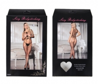 Standard Product Name: Black, made from high-elasticity nylon spandex yarn, extra large fishnet design, decorated with bows at the front center, open-crotch, M/XL, sexy garter belt bodysuit with bows and open-crotch.