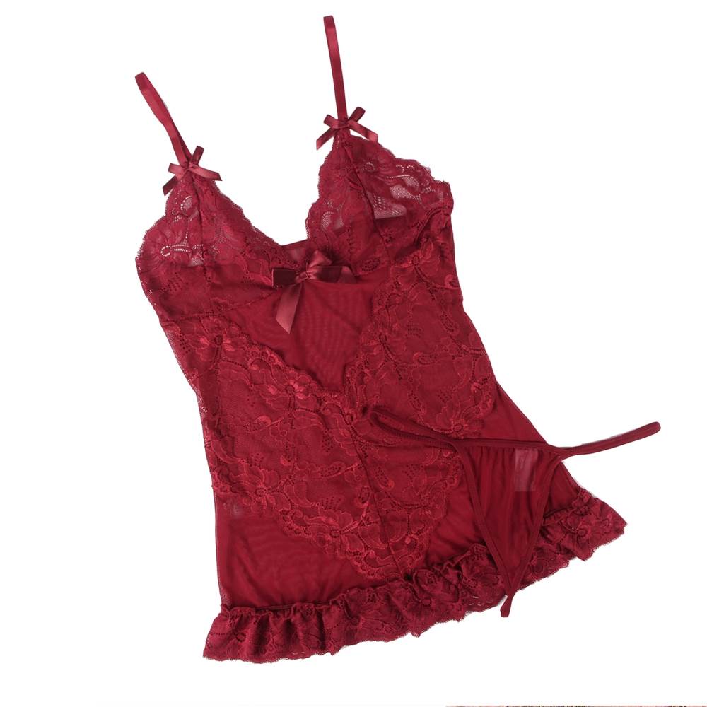 Product Name Dark Red Deep V Neck Plus Size Lace Sexy Slim Sleepwear With Thong