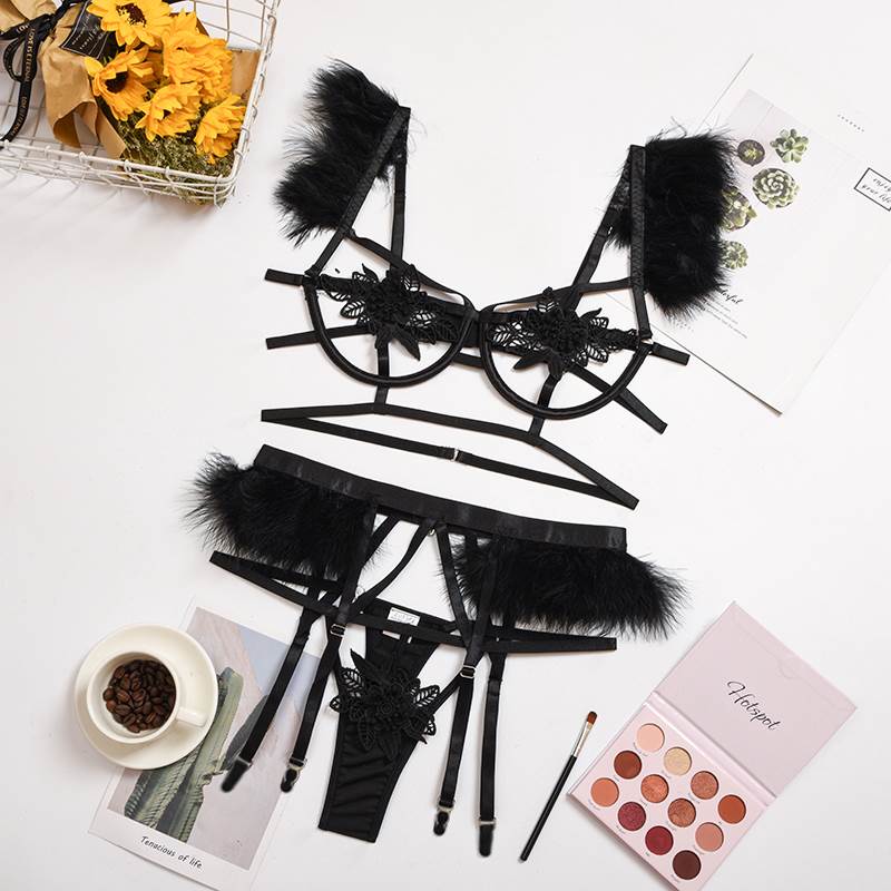 Product Name Sexy 3pcs Black Elegant Embroidery Applique Feather Bra Panty Set With Underwire