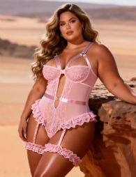 Standard product name: Available in black, pink, red, and white; mesh + lace; steel ring at the chest; back buckle design; adjustable bust; lace ruffle trim at the leg openings; adjustable garter straps with non-removable lace leg rings; opening buckle design in the crotch area; adjustable shoulder straps; size M-5XL plus size; sexy women`s bodysuit.