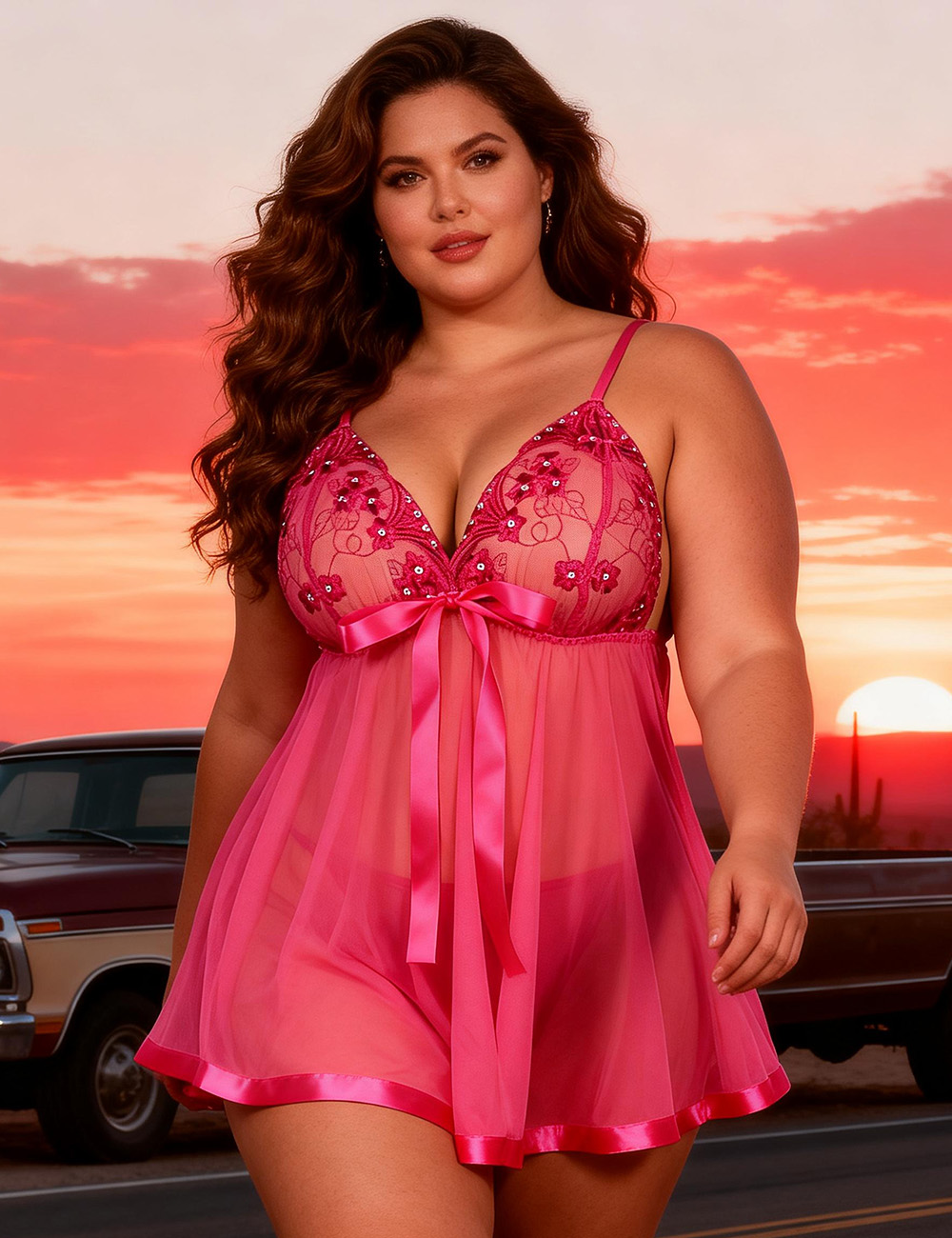 Home > Wholesale Plus Size Lingerie > Pink See-through Plus Size Nightdress Sexy Rhinestone Sleepwear